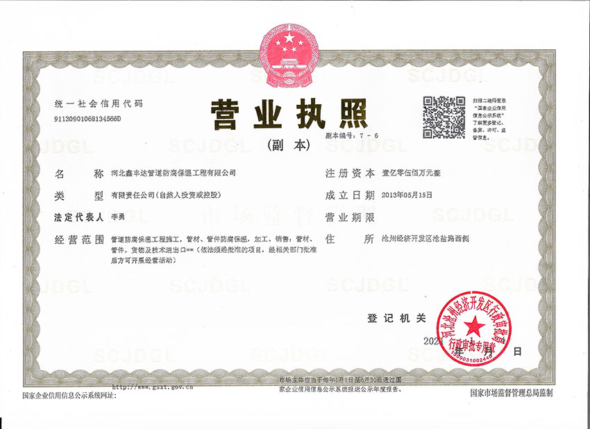 河北鑫豐達管道防腐保溫工程有限公司坐落于滄州市開發(fā)區(qū),通過ISO9000質(zhì)量管理體系認證。本廠擁有工程師4名、技術(shù)人員30名,員工60人,注冊資金5500萬元。專門從事3pe/2pe防腐鋼管、保溫防腐鋼管、防腐螺旋鋼管、水泥砂漿防腐鋼管、等配套工程施工,以及防腐材料研發(fā)制造的大型專業(yè)化企業(yè)。是河北省防腐保溫行業(yè)協(xié)會理事單位。年生產(chǎn)能力500萬平方米。